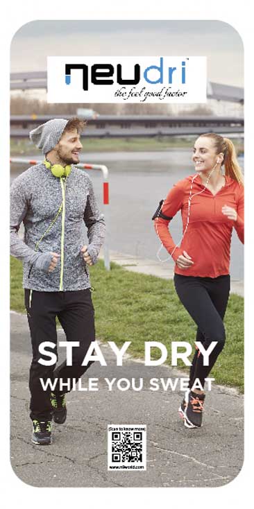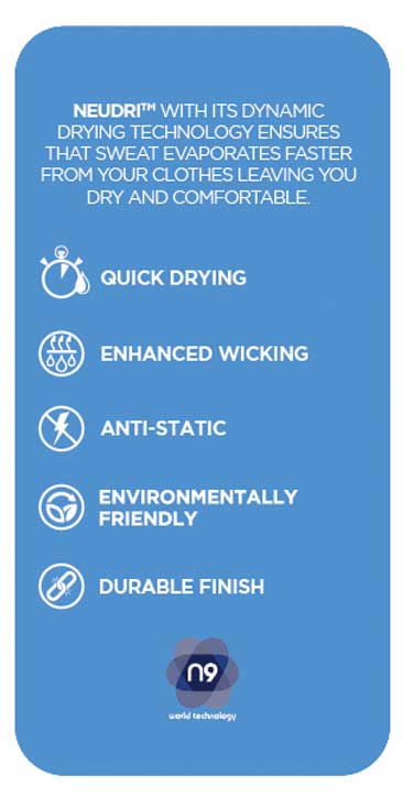 Presenting NeuDri, a quick drying technology designed to quickly dry your textiles. Formulated to rapidly wick sweat away from your skin and aid in quick evaporation, NeuDri ensures that the user stays dry and comfortable.